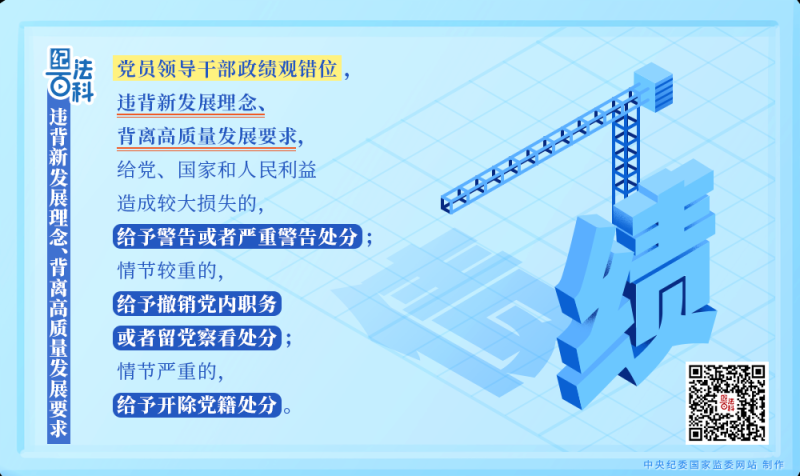 2023年12月修订印发的《中国共产党纪律处分条例》在总则中要求党组织和党员“切实践行正确的权力观、政绩观、事业观”,在分则政治纪律中充实党员领导干部政绩观错位,违背新发展理念、背离高质量发展要求的处分规定。