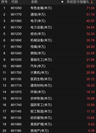 A股市场的结构也出现显著变化。东方财富Choice数据显示,2025年以来,按申万一级行业划分,有色金属行业股价涨幅超71%,通信行业股价涨幅超51%,电子、电子设备、传媒、计算机、生物医药等行业涨幅均超20%。