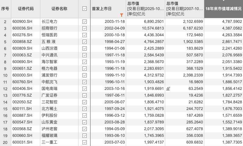个股市值方面,以2025年10月16日收盘来看,长江电力总市值从18年前的不到2103亿元增长至如今的6890.25亿元;招商银行、恒瑞医药总市值在18年间的增值也均超4000亿元。