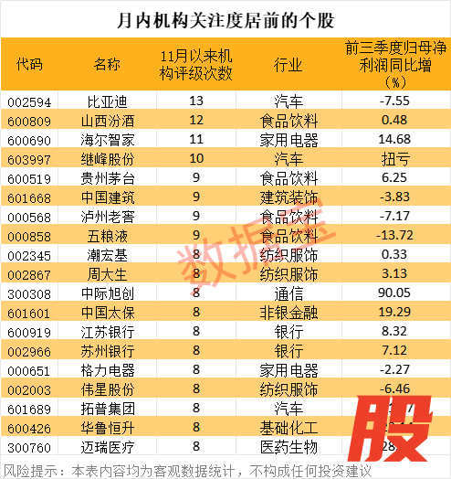 分个股来看,11月以来共有91股获得5家及以上机构评级,其中比亚迪、山西汾酒、海尔智家、继峰股份评级家数居前,分别为13家、12家、11家、10家。