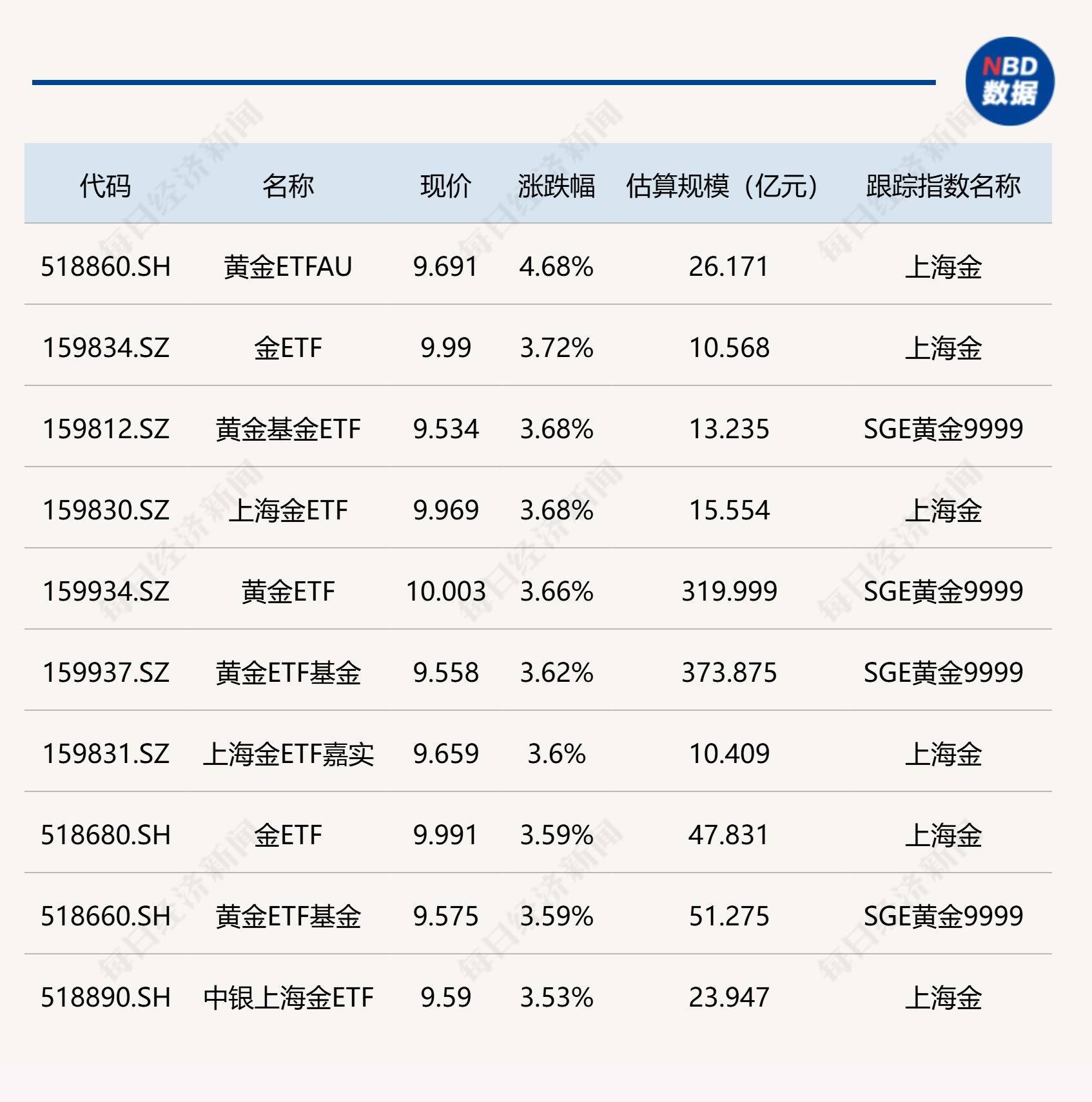 ETF涨跌幅方面,商品黄金相关ETF涨超3%。